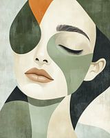 minimalistisch portret waarin geometrische vormen en organische lijnen samenkomen om een serene vrouwelijke expressie te creëren. De zachte aardetinten – variërend van olijfgroen en beige tot een subtiele oranje accentkleur – geven het werk een natuurlijke en harmonieuze uitstraling. De gesloten ogen en ontspannen gezichtsuitdrukking stralen een gevoel van rust en introspectie uit.