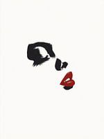 Dit beeld reduceert een gezicht tot zijn meest essentiële kenmerken: Ogen, neus en mond. De ogen en neus, getekend in diepzwart, steken duidelijk af tegen de witte achtergrond. De mond is ontworpen in felrood en vormt het centrale hoogtepunt van de compositie. Dit sterke contrast creëert een intense focus die vooral de sensualiteit van de lippen benadrukt.