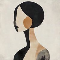 Dit eenvoudige abstracte portret combineert warme aardetinten met strakke, geometrische vormen om een moderne en stijlvolle uitstraling te creëren. De afbeelding toont een vrouwelijk figuur met zwart haar en grote, ronde oorbellen. De mix van donkere en lichte kleuren zorgt voor een intrigerend contrast dat de aandacht trekt en de verbeelding prikkelt. Dit kunstwerk is perfect voor wie houdt van eigentijdse kunst en een vleugje verfijning wil toevoegen aan het interieur.