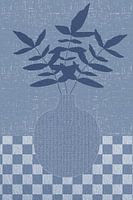 Minimalistische retro stilleven met bladeren in een vaas. Pastelkleuren met schaakbordpatroon en textieltexturen. Mixed media art met een botanische bladtekening, zachte textieltexturen en geometrisch ruitpatroon. Basic, Scandinavisch, Retro interieurstijl.