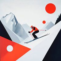 Een dappere skiër glijdt in felrood over de besneeuwde piste, omringd door gestileerde bergketens en grafische, gloeiende cirkels. De scherpe contrasten en minimalistische vormen creëren een gevoel van dynamiek en avontuur, terwijl het koele winterlandschap op de achtergrond een betoverende rust uitstraalt.