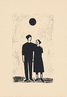 Een minimalistisch zwart-wit kunstwerk toont een stel dat naast elkaar staat op een lichtgekleurde, licht gevlekte achtergrond. De linkerfiguur is groter, de rechter kleiner, beiden in effen zwart zonder details in gezicht of kleding. Boven hen zweeft een zwarte cirkel die de compositie visueel in evenwicht brengt. De zwarte grond…