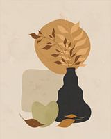 Minimalistisch stilleven van twee takken met bladeren in beige en bruin in een donkergrijze vaas, omringt van meer bladeren en organische vormen in licht beige, okergeel en groen.