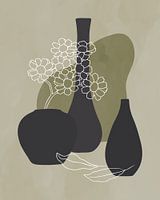 Het minimalistische stilleven toont drie vazen, elk met een unieke vorm in antraciet kleur. Een van de vazen bevat op duizendblad geïnspireerde bloemen, getekend met lijnen. Voor de vazen herhalen twee bladeren de witte kleur van de bloemen. Om de indruk van diepte te vergroten siert een organische vorm in groen de achtergrond, terwijl de achtergrond zelf een serene lichtgroen-grijze tint heeft. Het kleurenpalet blijft harmonieus neutraal en zorgt voor een tijdloze esthetiek.