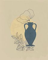 Minimalistische illustratie van een stilleven met een bloem in een blauwe amfoor, een takje met bladeren op de voorgrond en een grote organische vorm op de achtergrond.