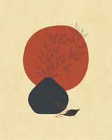 Minimalistisch stilleven met een tak met bladeren in een donkergrijze vaas. Achter de vaas herinnert een bijna ronde vorm in terracotta rood aan de ondergaande zon. Op de voorgrond herhalen enkele bladeren de twee kleuren. De achtergrond is beige. De tak en de bladeren zijn met inkt getekend, de rest is mit aquarelverf geschilderd met een zichtbare textuur.