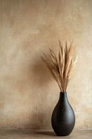 Deze prachtige afbeelding combineert minimalisme en natuurlijke elementen tot een perfect uitgebalanceerd kunstwerk. De elegante zwarte vaas is gevuld met sierlijk pampasgras, dat met zijn zachte beige tinten een rustgevende en warme sfeer creëert. Ideaal voor moderne interieurs, deze compositie straalt eenvoud en verfijning uit. Het subtiele kleurenschema past perfect bij verschillende decoratiestijlen, zoals Japandi, Scandinavisch of minimalistisch. Plaats dit beeld in een woonkamer, hal of slaapkamer om een vleugje natuurlijke elegantie toe te voegen. Perfect als decoratie of als inspiratie voor een rustige, moderne woonruimte.