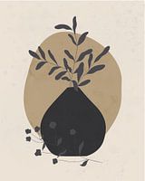 Minimalistische illustratie van een stilleven van twee takken en een vaas, met een natuurlijke vorm op de achtergrond. De kleuren - beige, lichtbruin en antraciet - zijn bijna neutraal en passen bij veel interieurstijlen.