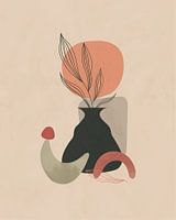 Minimalistisch stilleven van een tak met bladeren - getekend met inkt - in een donkergrijze vaas, omringt van organische vormen in variaties van grijs en terracotta rood. De achtergrond is beige. De illustratie is met aquarelverf geschilderd met een zichtbare textuur.