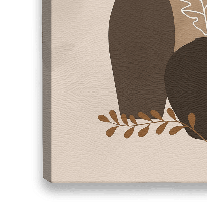 Het minimalistische stilleven toont twee vazen met bladeren en een takje, en een enkel takje op de voorgrond. Een organische vorm achter de vazen helpt om de indruk van diepte te vergroten. De illustratie is ontworpen in bruintinten (plus wit) en bijna monochroom, wat zorgt voor eein tijdloze esthetiek.
