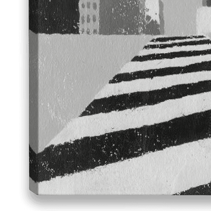 Deze gestileerde, minimalistische illustratie toont een stadsstraat vanuit een laag perspectief, waarbij het oog direct over de lengte van de straat wordt geleid. Het wegdek is gemarkeerd met brede zwarte strepen op een witte achtergrond, die ongelijk zijn gerangschikt en diepte creëren. Links en rechts staan eenvoudige, rechthoekige…
