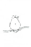 Dit minimalistische vogelportret is een zwart-witte inkttekening in staand formaat. Het toont een schattig musje dat op een tak van een boom zit. Hij lijkt gelukkig, geniet van de dag en glimlacht naar de wereld. Misschien laat hij jou ook glimlachen en brengt hij je wat geluk.