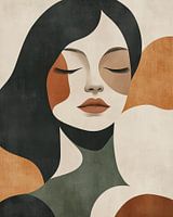 ombinatie van minimalistische vormgeving en warme aardetinten. De vrouwelijke figuur wordt afgebeeld met gesloten ogen en een serene expressie, wat een introspectieve en dromerige sfeer oproept. De compositie bestaat uit vloeiende geometrische vormen die in elkaar overlopen, waarbij zwarte, groene, beige en terracottakleuren harmonieus samensmelten.