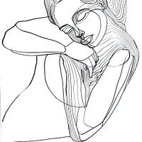 Deze lijnen volgen de contouren van haar gezicht en lichaam, waarbij sommige delen met meer detail en diepte zijn uitgewerkt door de dichtheid van de lijnen te variëren.