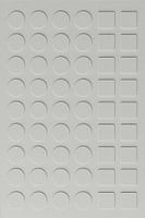 Een reliëf van herhalende cirkels en vierkanten, uitgevoerd in een monochroom tint.