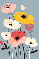 Een moderne, minimalistische illustratie van klaprozen in zachte pasteltinten tegen een rustige grijsblauwe achtergrond. De bloemen zijn gestileerd weergegeven in wit, roze, geel en koraal, met karakteristieke donkere harten en sierlijke stammen. De compositie straalt zowel elegantie als speelsheid uit, perfect passend in een hedendaags…