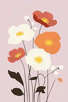 Een stijlvolle minimalistische illustratie van klaprozen in warme aardetinten en wit tegen een zacht lila achtergrond. De bloemen zijn elegant gestileerd met een moderne twist, waarbij de eenvoudige vormen en het uitgekiende kleurenpalet zorgen voor een rustgevende maar toch krachtige compositie die perfect past in een hedendaags interieur.
