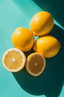 Dit minimalistische stilleven presenteert een verfrissende compositie van heldergele citroenen tegen een strakke turquoise achtergrond. De scherpe contrasten tussen de warme, textuurrijke citroenen en de koele, gladde achtergrond creëren een visuele spanning die zowel verfrissend als intrigerend is. De geometrische eenvoud van de ronde…