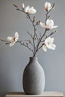 Een compositie van bevallige, wit-roze magnoliatakken die schijnbaar uit een grijze, keramische vaas ontspruiten. Het vormt een sierlijke, tedere stilleven, een eerbetoon aan de oneindige schoonheid van de natuur in al haar tijdelijke glorie.
