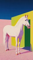 Dit kunstwerk toont een wit paard staand op een roze korrelige ondergrond, met een achtergrond opgebouwd uit vlakke kleurvlakken in pastel roze, felgeel en donkergroen. De compositie is strak en helder. Het paard staat in een open ruimte met duidelijke contouren en een abstracte omgeving, wat een gevoel van tijdloosheid en verstilling…