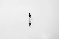 Deze serene zwart-wit compositie toont een vogel die elegant over een stil wateroppervlak loopt, waarbij zijn reflectie een perfecte symmetrie creëert. De eenvoud van de witte achtergrond versterkt het minimalistische karakter en laat de vogel en zijn reflectie volledig tot hun recht komen. Dit beeld straalt rust en balans uit, perfect voor liefhebbers van kunst die stilte en natuurlijke harmonie waarderen.