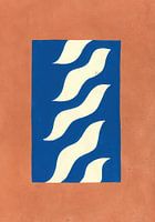 Dit minimalistische ontwerp heeft een blauw vierkant op een terracottakleurige achtergrond. Vier witte, diagonaal geplaatste golfvormen creëren beweging en ritme. De golven zijn helder, gestileerd en zonder extra patronen of texturen. De terracotta achtergrond vertoont subtiele kleurvariaties en een licht ruwe textuur die het contrast…