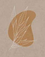 Minimalistische illustratie van een tak met bladeren in wit en een natuurlijke vorm in licht bruin op de grijs-beige achtergrond.