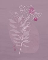 Minimalistische illustratie van een bloem en een tak met bladeren, met vijf organische vormen op de achtergrond. De kleuren zijn variaties van roze/pink en gedekt paars.
