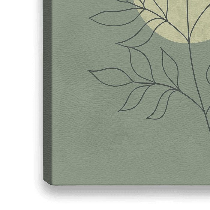 Minimalistische illustratie van een tak met bladeren en een natuurlijke vorm op de achtergrond. De kleuren - variaties van gedekt groen - zijn geïnspireerd door de kleuren op een vroege ochtend in de lente.