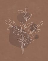 Minimalistische illustratie van een tak met bladeren en vier organische vormen, in de kleuren wit en bruin.