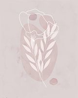 Minimalistische illustratie van een tak met bladeren, een bloem en vier organische vormen op de achtergrond. De kleuren zijn variaties van licht lavendel-paars.