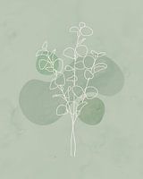 Minimalistische illustratie van eucalyptus-takken in wit, en drie organische vormen op de achtergrond, in variaties van groen-grijs.