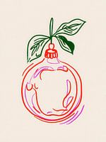 Deze verfijnde illustratie toont een kerstbal die op speelse wijze is getekend met vloeiende lijnen in rood, roze en groen. De zachte, minimalistische stijl geeft het werk een lichte en moderne uitstraling. De bal lijkt bijna te zweven, met een elegant blad aan de bovenkant dat natuurlijke frisheid toevoegt aan het ontwerp. De eenvoud maakt het beeld tijdloos en stijlvol – een subtiele verwijzing naar de feestdagen zonder overdaad. De combinatie van warme en koele tinten zorgt voor balans en harmonie, terwijl de losse lijnen beweging en spontaniteit uitstralen. Dit kunstwerk vangt het gevoel van feestelijkheid op een rustige, verfijnde manier. Perfect voor wie houdt van modern design met een vleugje speelsheid, ideaal voor in een minimalistisch of Scandinavisch interieur.