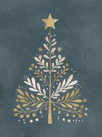 Dit kunstwerk toont een elegante kerstboom in een moderne, minimalistische stijl. In plaats van naalden bestaat de boom uit sierlijke, gestileerde bladeren en takken die zich waaieren als een feestelijk patroon. De kleuren goud en wit geven een warme en luxe uitstraling tegen de donkere, blauwgrijze achtergrond. Helemaal bovenaan straalt een gouden ster, symbool van licht en hoop. Kleine stipjes en sneeuwvlokken verspreid rondom de boom zorgen voor een speelse en feestelijke sfeer. De eenvoud en symmetrie van de vormen maken dit werk tijdloos en stijlvol. Het combineert traditionele kerstsymboliek met een eigentijds, decoratief ontwerp. Het geheel straalt rust, feestelijkheid en warmte uit, perfect passend bij de intieme en vrolijke sfeer van de feestdagen. Deze boom voelt meer als een kunstwerk dan een traditionele kerstboom, waardoor het ideaal is als modern en sfeervol decoratief element.