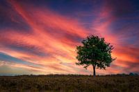 Een prachtige heide landschap met een indrukwekkende zonsondergang op de Nederlandse Veluwe. Jonge solitaire frisgroene boom tegen een rood gekleurde wolkenlucht bij het vallen van de avond. Minimalistisch landschap voor kantoorkunst of als styling voor een huis interieur of bedrijf.