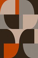 Dit moderne abstracte kunstwerk heeft geometrische basisvormen en strakke lijnen in een retrostijl. Scherpe cirkels, blokken en dynamische vormen zijn gerangschikt met balans en ritme, inspiratie puttend uit Bauhaus, architectuur en abstract expressionisme. Het kleurenpalet bestaat uit terracotta, wijnrood, gedempt wit, verbrand oranje, kaki groen, diep blauw, zwart en aardebruin, wat warmte en harmonie creëert in elke compositie.