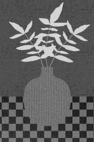 Minimalistische retro stilleven met bladeren in een vaas. Pastelkleuren met schaakbordpatroon en textieltexturen. Mixed media art met een botanische bladtekening, zachte textieltexturen en geometrisch ruitpatroon. Basic, Scandinavisch, Retro interieurstijl.