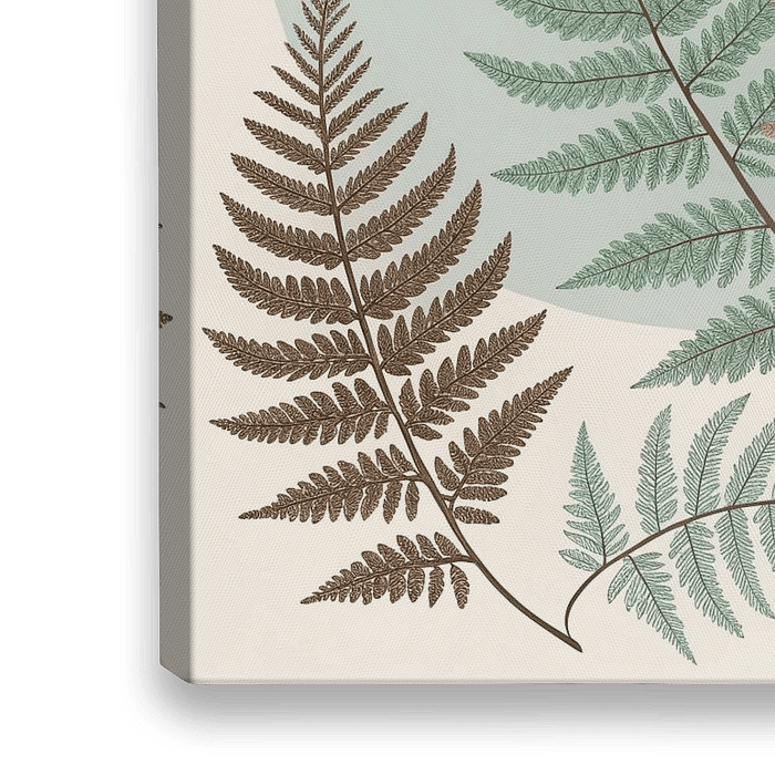 Dit minimalistische kunstwerk bestaat uit drie gestileerde varenranken tegen een zachte, ronde achtergrond. De bladeren zijn weergegeven in verschillende aardetinten groen en bruin, waardoor de ingewikkelde patronen van de bladeren goed uitkomen. De compositie is strak en sereen en roept een gevoel van natuurlijke rust en eenvoudige elegantie op.