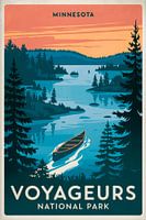 Een schilderachtig scenario dat de rustige schoonheid van het Voyageurs National Park vastlegt. Zachte golven omgeven door weelderig groen terwijl een kano langzaam over het glinsterende meer glijdt. De warme kleuren van de zonsondergang geven de kamer een ontspannen sfeer. Perfect voor een woonkamer die rust en nabijheid van de natuur…
