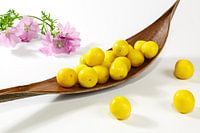 Stillleben; Küchenbild; Mirabellen; Obst; Früchte; Frucht; Kernobst; Obsternte; Pflanze; Pflaumen; Schiffchen; Kokosblatt; Malve; Rosenmalve; Spitzblättrige Malve; Sigmarskraut; Sigmarswurz