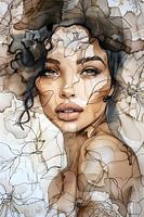 Expressief aquarel portret van een mooie vrouw in aardetinten met waterverf, inkt en lijntekening elementen op papier.
