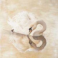 Mirror of Serenity - Dit zwanenschilderij toont een serene en gracieuze zwaan die gebogen op het wateroppervlak ligt. Deze majestueuze vogel, centraal geplaatst in het schilderij, heeft zijn hals sierlijk gebogen in een bijna perfecte boog waarbij zijn kop bijna zijn veren raakt. De zwaan's verenpracht is rijk gedetailleerd, waarbij de witte tinten overlopen van zuiver wit tot zachte crèmekleuren, die het zachte licht reflecteren dat blijkbaar van een onzichtbare bron komt. Het water waarin de zwaan zich bevindt, is subtiel weergegeven met zachte golfjes, die een spiegelachtige reflectie creëren van de zwaan zelf, wat een bijna dubbel beeld oplevert. De achtergrond is gehuld in zachte beige en witte tinten die rust en kalmte uitstralen. Dit zwanenschilderij gebruikt een realistische stijl met een hint van romantische zachtheid in het kleurgebruik en de lichtval.