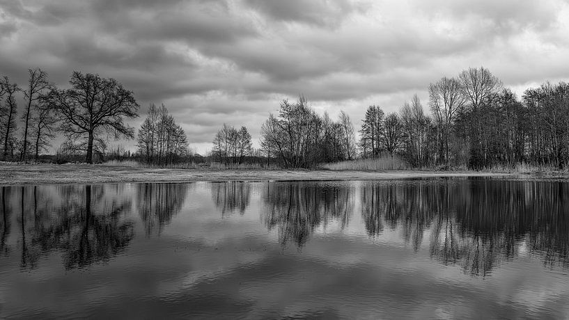 De natte Nederlandse natuur in januari kan voor schilderachtige spiegelingen zorgen. Deze foto is genomen in natuurgebied de Zumpe in Doetinchem.