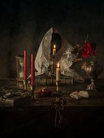 Een Vanitas stilleven in de stijl van de Oude meesters, vol symboliek. Herinneringen aan wat was, liefde, kennis vergaard, de vergankelijkheid. De tijd die ongenadig door tikt. Een boek dat bijna gesloten is. Sleutels voor deuren die openen en sluiten. Aan het eind kun je alleen in de spiegel kijken en weten dat je hebt lief gehad. Een…
