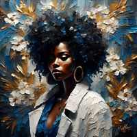 In een wereld die vaak probeert te definiëren en te beperken, staat Miss Independent overeind, een baken van zelfverzekerdheid en onwrikbare geest. Dit boeiende digitale kunstwerk portretteert een verbluffende Afro-Amerikaanse vrouw, haar rondingen geaccentueerd door een stijlvol ensemble van wit en blauw, haar blik standvastig en haar houding die een onmiskenbaar vertrouwen uitstraalt.