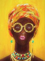Een gouache schilderij van een jong Afrikaans meisje. Modebewust met haar grote gouden zonnebril en goudkleurig sieraden. De vrolijkheid straalt je tegemoet.