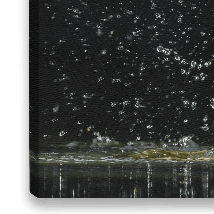Mission accomplished! A beautiful male kingfisher just left the water with a small fish. The black background and the splashing water droplets really create for a stunning image! This amazing little bird, with a length of approx. 16 cm, has a striking blue colored upper feather deck while the under part is yellow. The difference…