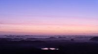 De mist bedekt de duinen en de bomen op bij West aan Zee op Terschelling tijdens het schemerlicht vlak na de zonsondergang.