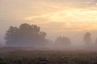 De silhouettten van bomen tijdens een mistige zonsondergang op natuurreservaat Ten Haagdoornheide in Houthalen-Helchteren, België.