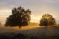 De zon schijnt door de bomen op een mistige avond op natuurreservaat Ten Haagdoornheide in Houthalen-Helchteren, België.